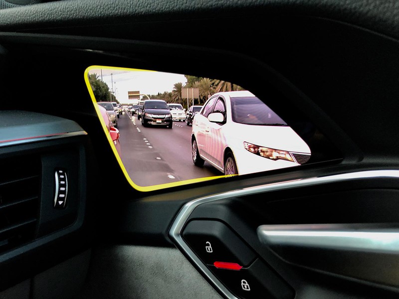 e-tronの注目点のひとつがバーチャルエクステリアミラー(オプション)だ。ミラーの代わりにカメラを使っており、メリットとして死角が少なくなることと、空力の改善があげられている。画像は通常ならオーディオ用のスピーカーがはまっているであろうドアの内張り部分のモニターに映し出される。かなり鮮明である。