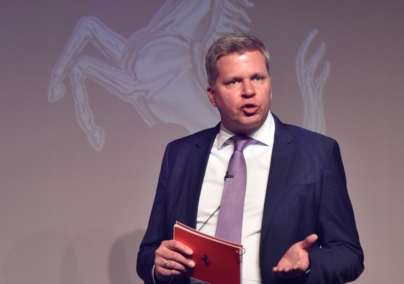フェラーリレッドに囲まれた会場で、クネヒテル氏は濃紺のスーツにパープルのネクタイ、腕にはブラックのウブロ(フェラーリと提携関係にある)というシックなスタイルをキープしています。