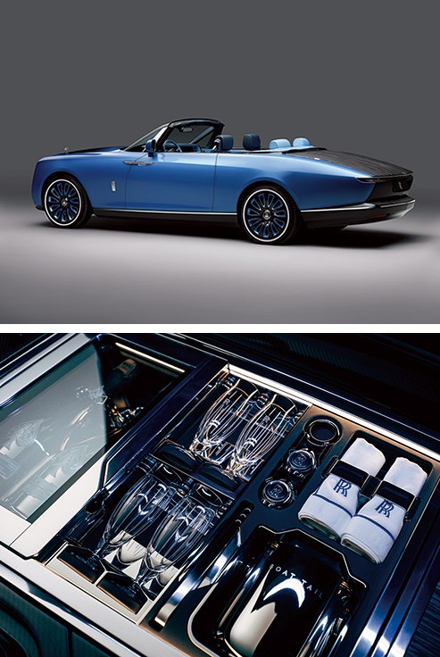 さて、このボート・テイル、製作はすべて手作業で、4年以上の歳月を費やしました。ボートのようなリア部分は鳥の羽のように開き、収納庫の片面にはクリストフル社製の専用デザインのカトラリーが収められており、もう片面の冷蔵庫には、顧客のお気に入りのヴィンテージのシャンパンを収納します。