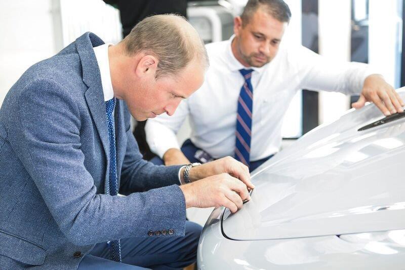 2017年9月に英王室ウィリアム王子がウォーキングにあるマクラーレン・オートモーティブを訪れたときの模様(バッジを取り付けている)