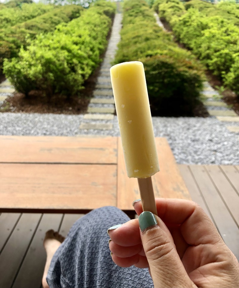 ▲ 「湯上がりテラス」の前には茶畑。ほてった身体をアイスキャンディ―で鎮める筆者……なんですが、親指のささくれは見ないで~。
