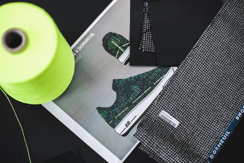 それがドーメル×ザ・シュー・サージョンのコラボスニーカーです。 ボディはエアフォース1(Air Force1)をベースにしつつ、 生地は特別なファブリックを使用したものなんです。