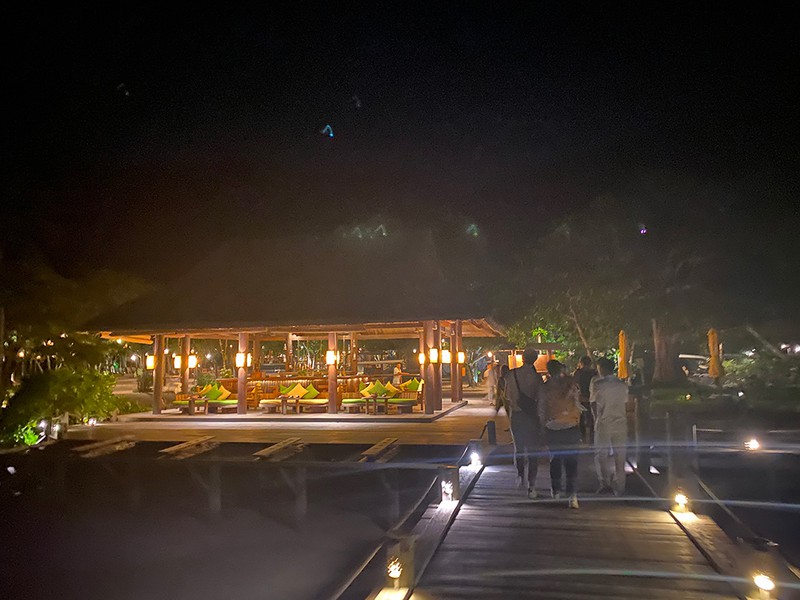 ライトアップされた島のエントランスが、幻想的でロマン溢れる雰囲気に。到着後には、早速ディナーを堪能することができます。