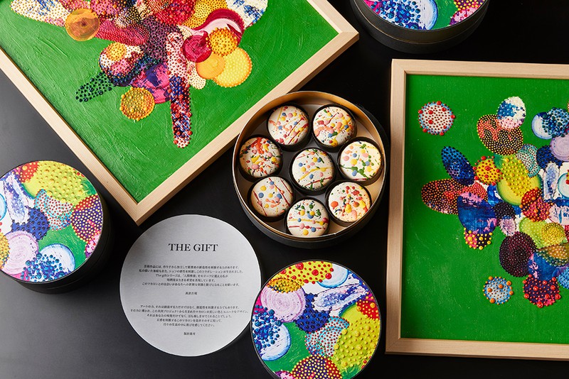 というのもコチラは、ホテルの総料理長の熱烈なオファーにより実現した、現代アート作家として活躍する髙倉吉規氏とのコラボレーションで誕生した限定マカロンなんです。キャンバスに見立てた白いマカロンに、彼の作品である油絵の点描画を想起させるデザインを施したものを購入できるという、まさにアートスウィーツ。