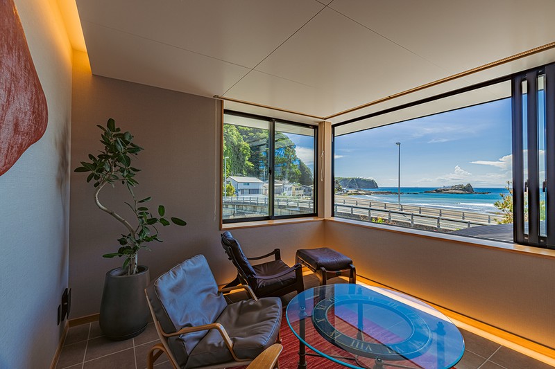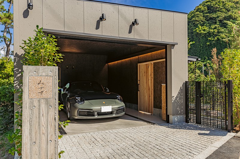 南房総の竜島海岸に近接するこちら、まず驚かされるのは、敷地内にプライベートガレージがあること。これなら、誰にも会わず、チェックイン/チェックアウトが出来るし、愛車を雨ざらしにすることもありません。車庫にはEV、PHEVの充電器も備えているなど、万全です。