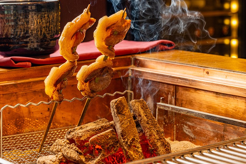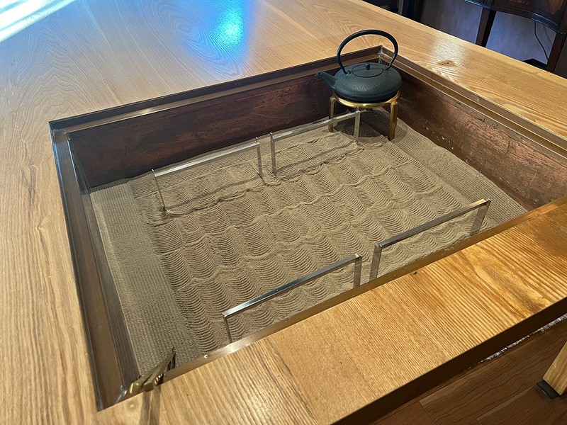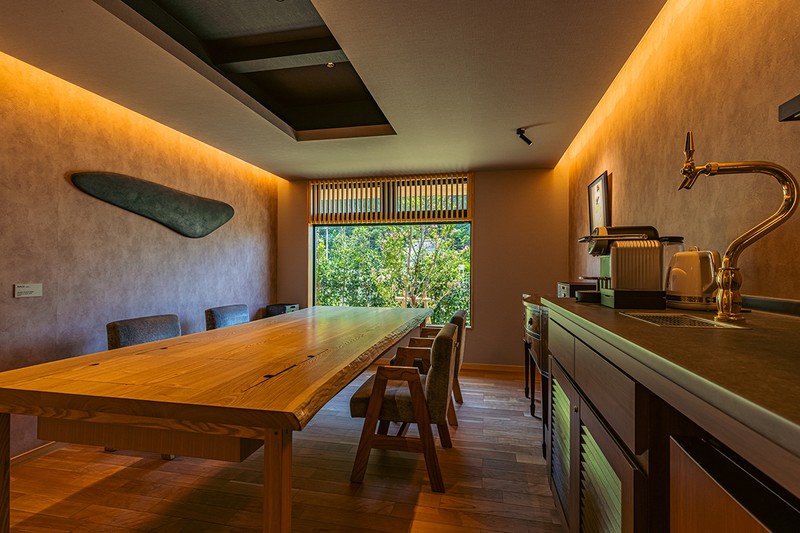 いやぁ、飲兵衛にはたまらないですね。しかもしかも、このダイニングルームのテーブル、パカッと開くと、囲炉裏が現れちゃいまして、夜も朝もこちらで炭焼き料理がいただけちゃうというのですよ。