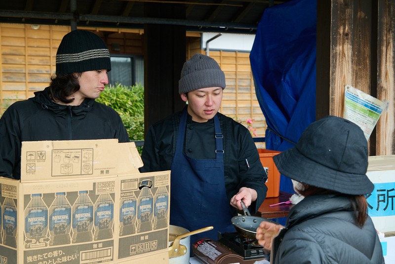 ▲ 珠洲「わくわく広場」での炊き出しに参加した田島優己さん(中央)。田島さんは現在開業準備中で、注目の料理人のひとり。