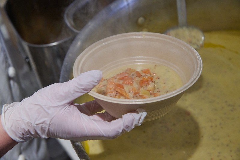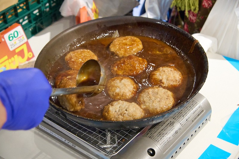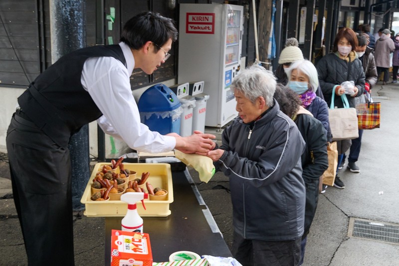 驚いたのは、美しくサシが入った神戸牛のステーキや、自家製のハム(脚1本でした!)、ウニのパスタなど、いわゆる“炊き出し”ではお目にかかれない贅沢な食材が使われた料理であったこと。まさにレストランでいただくようなクオリティの料理がどんどんふるまわれる様子に市民のみなさんもヒートアップ! 熱々の料理をおいしそうに召し上がっていました。