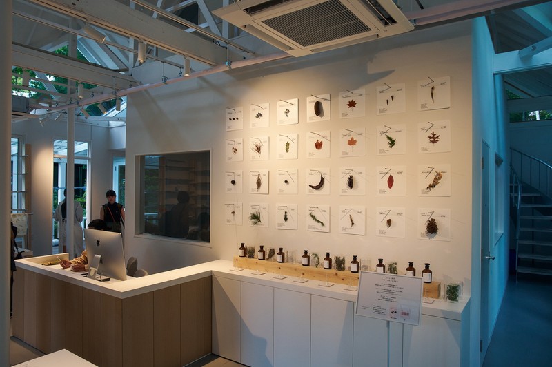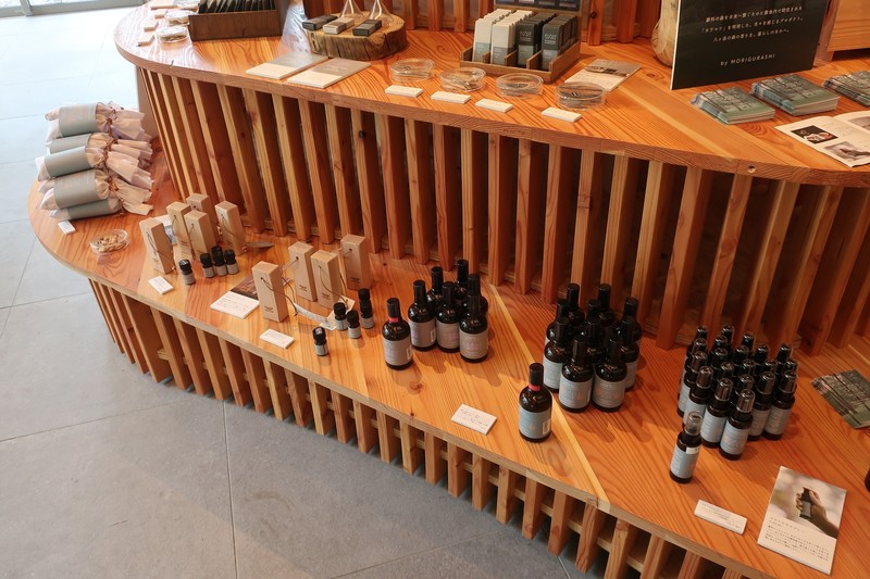 ▲ 蓼科の間伐材チップを袋に詰めた消臭・乾燥剤や、樹液から作ったアロマオイルなどオリジナルのハンドメイド商品を展開。