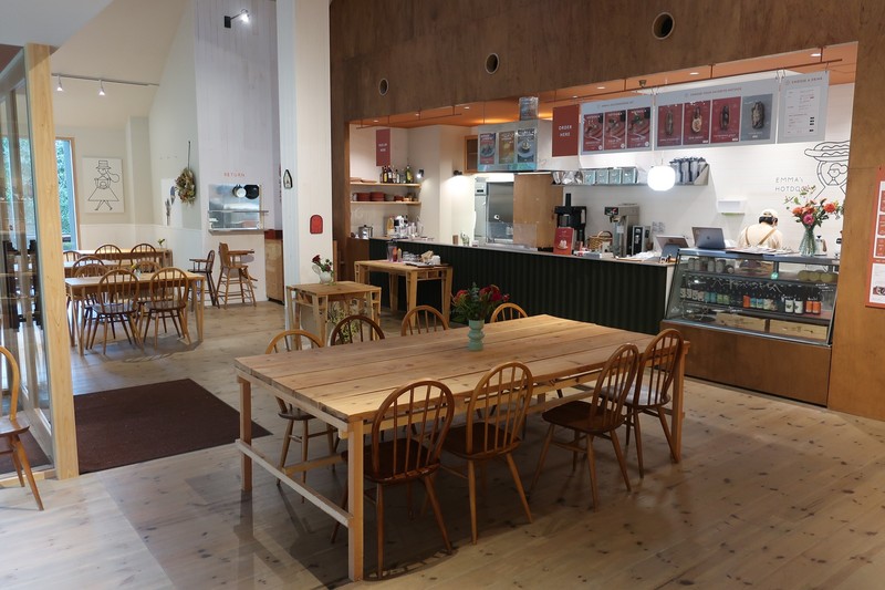 ▲ 「EMMA’s FOOD & GROCERY」の奥にあるカフェスペースでは自家製ソーセージを使用したホットドッグが食べられる。もちろんカフェとして仕事利用にも便利。
