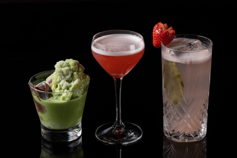 「オーク ドア」に併設する「オーク ドア バー」では、江戸文化からインスピレーションを得たカクテル3種を展開(写真左から「抹茶かき氷(1800円)」「赤富士(1700円)」「柏餅(2000円/すべて税サ別)」)。