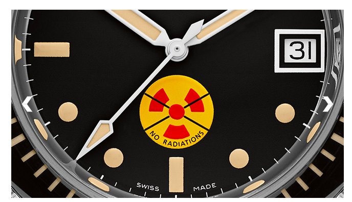 そしてそんなアイコニックなモデルを再解釈した一本が、今年限定新作として登場。1960年代中頃に発表された当時のモデルは、その一部がドイツ海軍の潜水戦闘部隊にも使用され、「ノーラディエーション(放射性物質不使用)」ロゴが、6時位置にスタンプされているのが特徴です。これはラジウム入りの発光塗料を使用していなかったことを示しています。