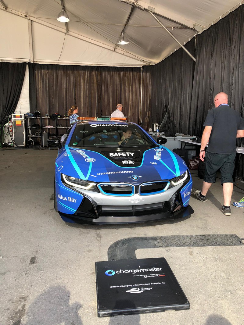 セーフティカーはBMWのi8。床にあるのは充電器。ワイヤレスでこの上に乗るだけで充電が可能。