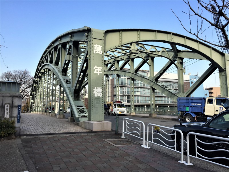 店を出ると松尾芭蕉が暮らした芭蕉庵跡に建つ芭蕉記念館も近い。そして隅田川の方へ歩くと小名木川に架かる萬年橋があります。深川のあたりはこういう鉄製の渋い橋が随所にあるんです。ここは安藤広重が「名所江戸百景」で描いた場所。亀のぶら下がったこちらの絵をご存知の方も多いでしょう。