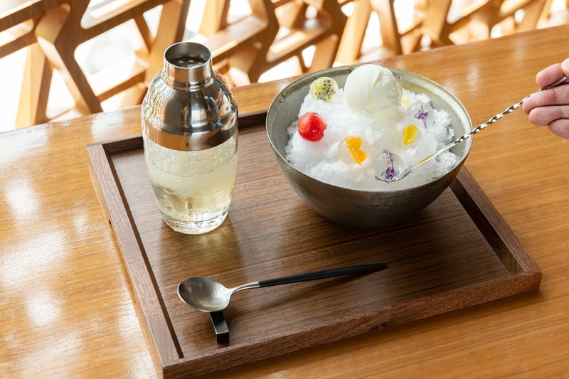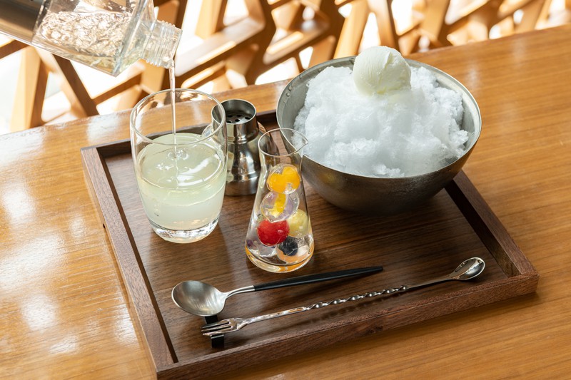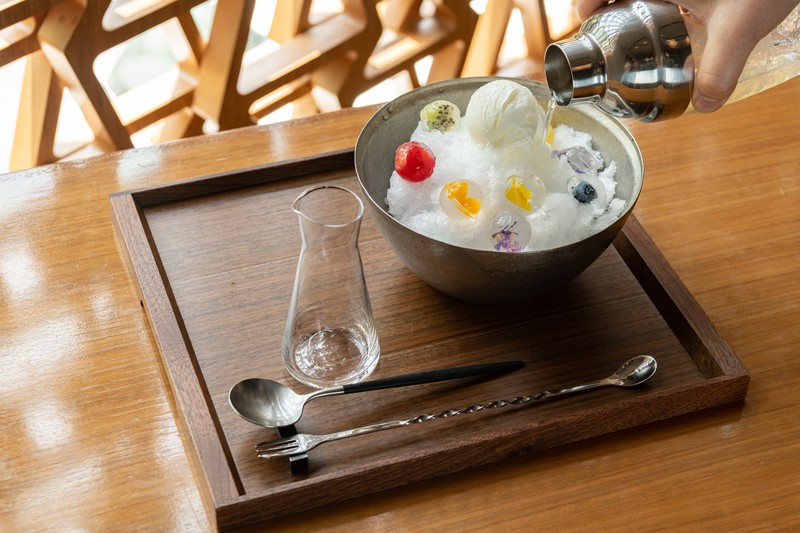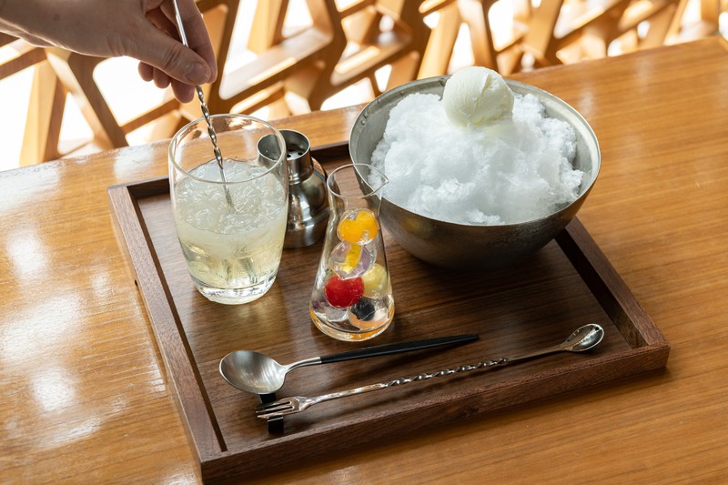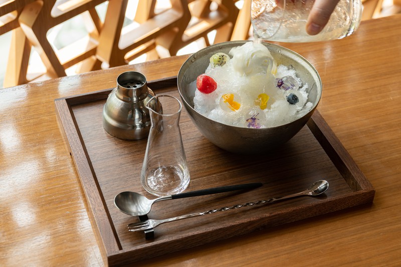さらにふわさらで頭がキーンとしないと評判の軽井沢の天然氷の上に、濃厚なヨーグルトアイスが乗せられた状態で提供されます。でも同じトレイの上には色とりどりなエディブルフラワーやフルーツをゼリーに閉じ込めた直径15㎜ほどのジュエルボールが10個ほどと、炭酸を閉じこめたゼリーにオリジナルシロップを注ぎかき混ぜることで完成するスパークリングジェエルソースが。そう、この3つを絶妙に合わせながらいただくのが今年のかき氷なのです。