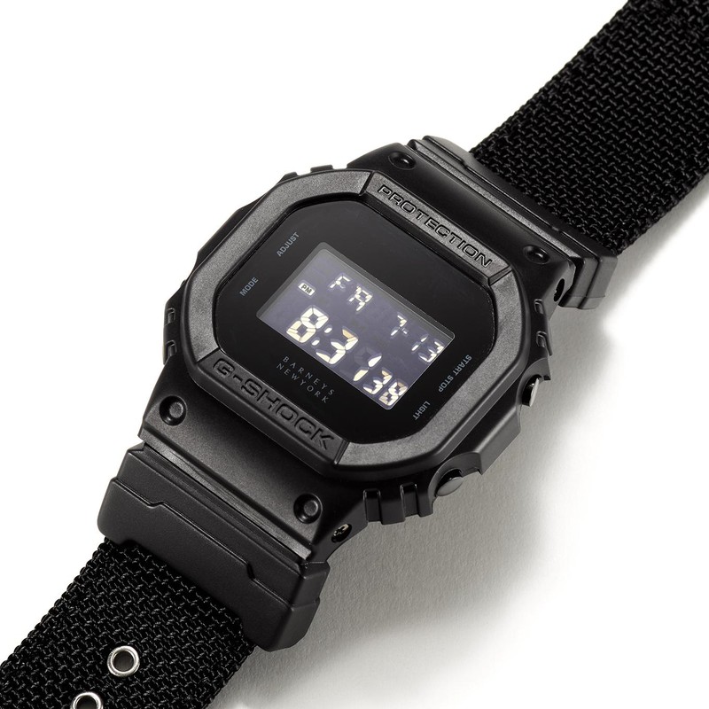 そして、この度バーニーズ ニューヨークでは“G-SHOCK”とのコラボレーションモデルを発売。G-SHOCKを象徴するスクエア型のシリーズ「DW-5600」をベースに、ケースとベゼルには樹脂、ストラップにはナイロン、ゴートレザーやアリゲーターという異なる素材を使いつつ、全体をブラックカラーで統一しました。