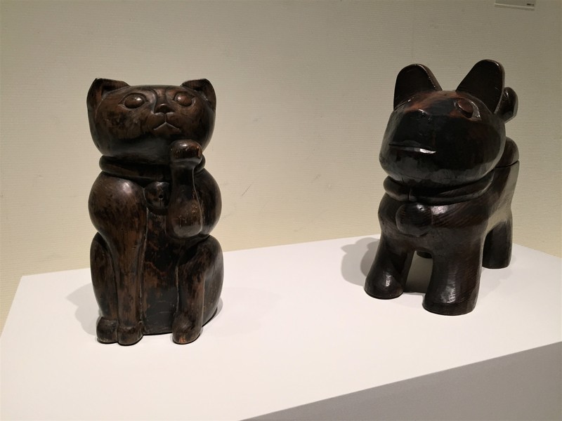 ともに昭和12年、47歳頃に作った木彫。招き猫は飼い猫「熊助」がいなくなって悲しむ娘のために彫ってあげたもの。