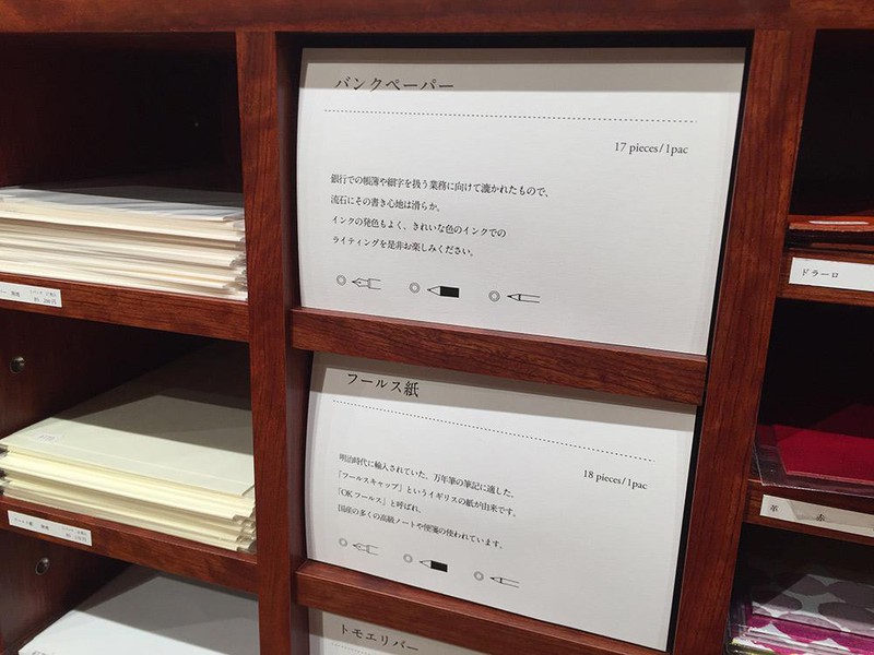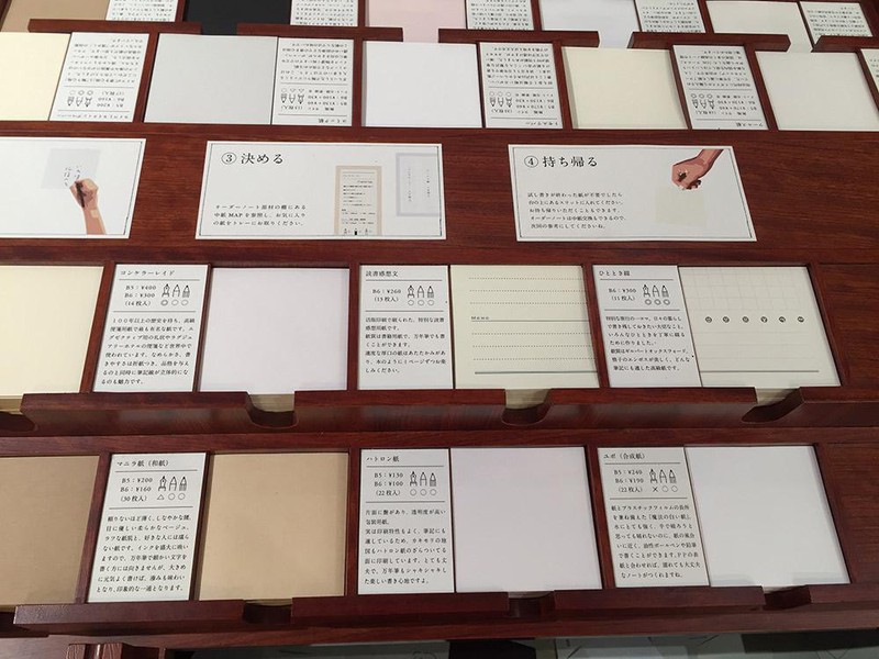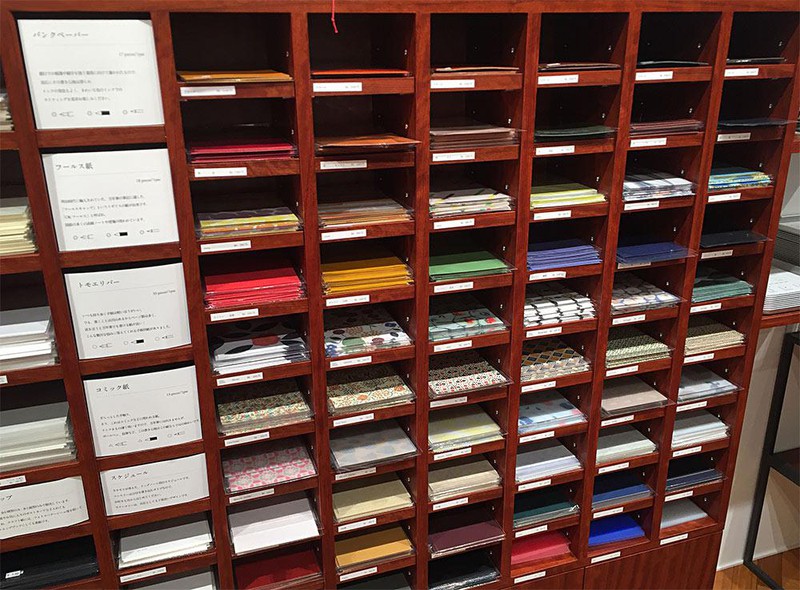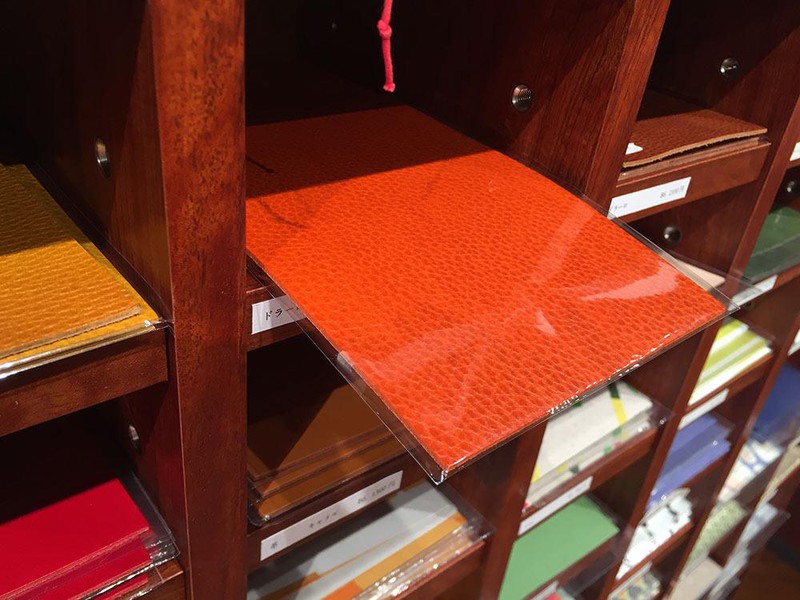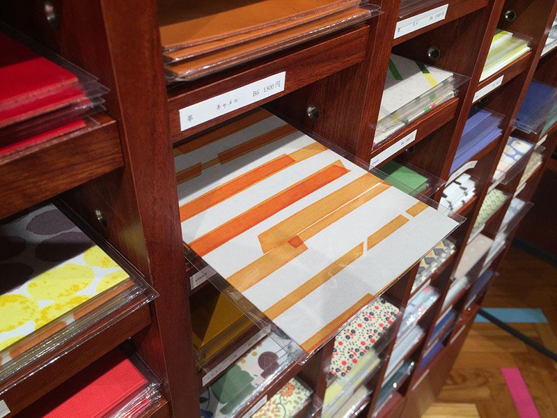 選び終わったら、お店の方にその場で製作・受け渡してもらえます。また、名入れサービスもアリ(受け渡しは後日)。上掲の写真のとおり、表紙だけでも選択肢が豊富。素材は紙から革まで、カラー・柄も様々です。