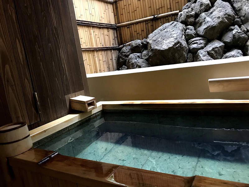 場所は、嵐山の有名な渡月橋からすぐのところという最高な立地。入り口の門をくぐると、築100年以上のかやぶき屋根の建物「茶寮 八翠」がありまして、コチラでウェルカムシャンパンをいただけます。通されたお部屋の扉を開けると、な、なんと天然温泉の露天風呂付き!(日曜日のチェックアウトまでに7回は入っちゃいました)