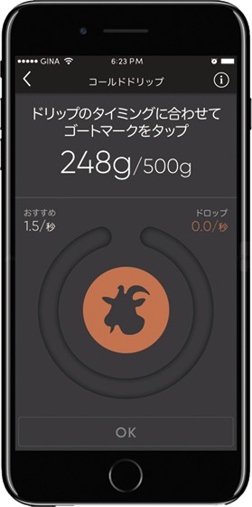 こちらはコールドドリップの画面。ドリップのタイミングに合わせて画面をタップすると、抽出時間を計測してくれます。