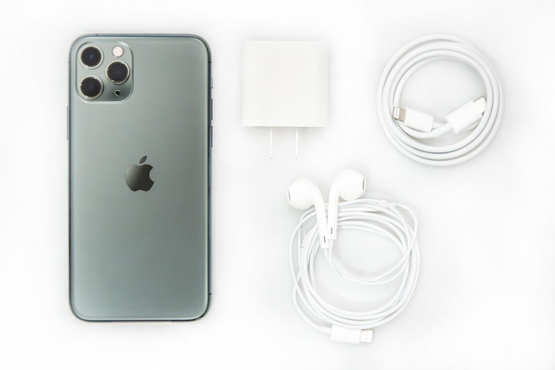 付属品一式。充電ケーブルは、iPhone側がLightning、充電器側がUSB Type-Cになります。イヤホンジャックもLightning端子に。