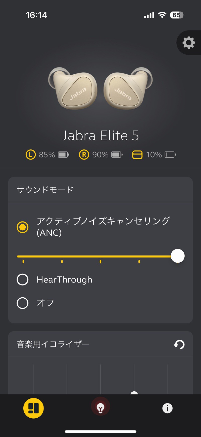 この「Jabra Elite 5」は、専用アプリ「Jabra Sound+」を使うことで「アクティブノイズキャンセリング(ANC)」と「ヒアスルー」が5段階で調整でき、自分にあったボリュームコントロールが可能に。音量を上げなくても音楽や動画音声をクリアに聴くことができるんです。