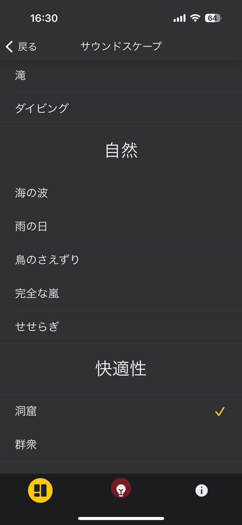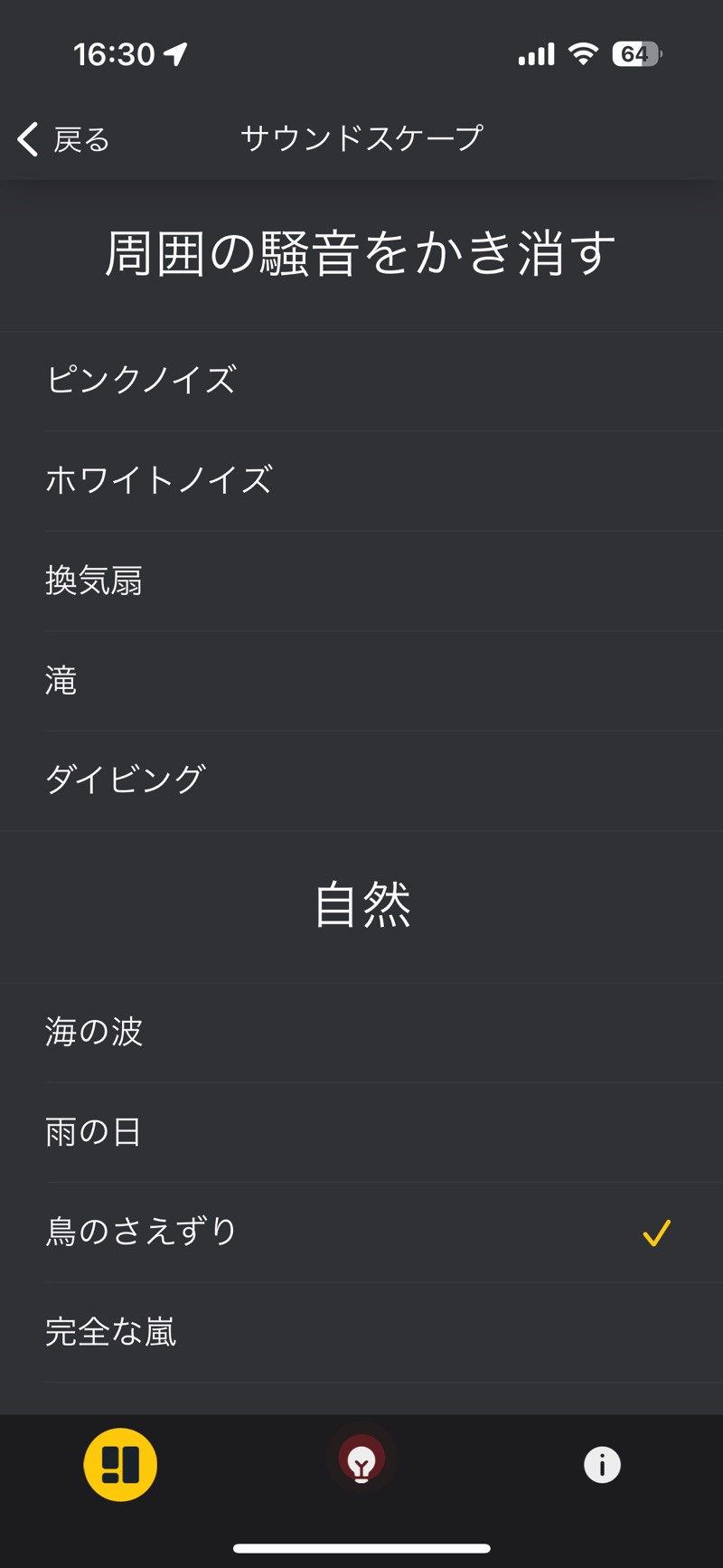 PC作業時や長距離移動時には「耳栓」代わりにイヤホンを使う方も多いでしょう。そんな時には専用アプリの「サウンドスケープ」がオススメです。「波の音」や「鳥のさえずり」など、自然の中にいるような環境音がプリセットで用意され、外音をシャットアウトしながら癒しの音に浸ることができます。