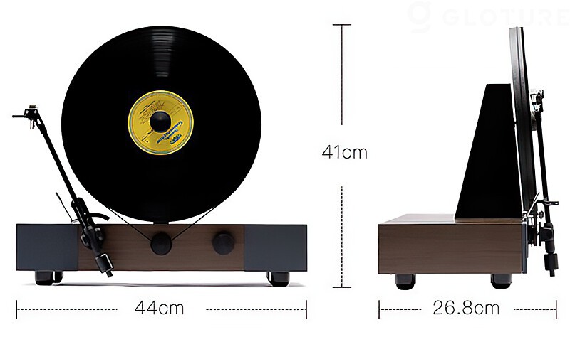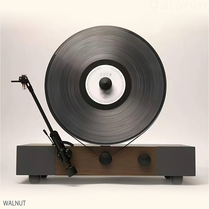 アナログレコードを設置するターンテーブルは垂直に近い85°で、アナログレコードの美しい記録面(音の振動が刻まれた面)が正面を向くように設計されています。その名の通り、レコードの盤面を「バーティカル(垂直)」に立てることで「見て」楽しめるプレイヤーとなっているんですね。