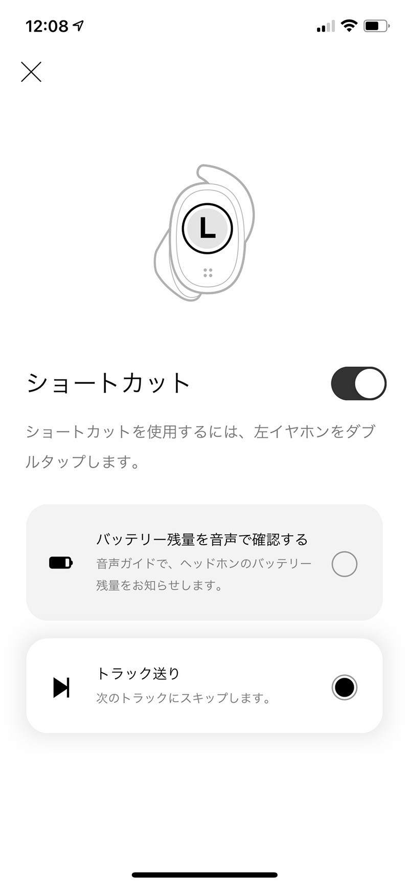 ▲ 左イヤホンのショートカット設定は「バッテリーの音声通知」と「トラック送り」の2種類から選択可。