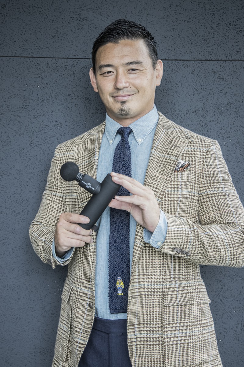五郎丸さんが持っているのは新発売の「パワープレート PULSE MINI+(パルス ミニ プラス)」。「パワープレート PULSE(パルス)」の機能をベースに、たった435gの手のひらサイズになったことで、さらに軽く持ち運びや空くなり、使う人や場所を問わず毎日のリフレッシュを気軽に叶える一台。