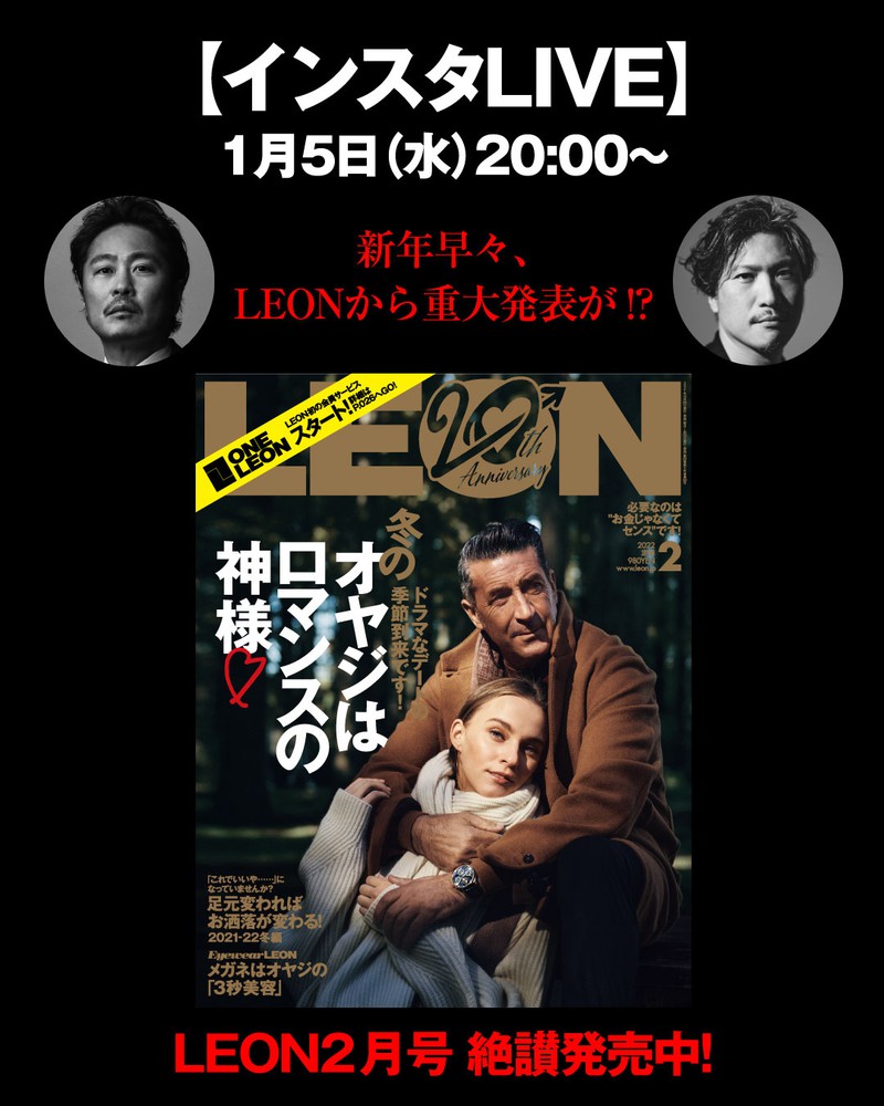 1月5日(水)20:00~、LEONがインスタライブを開催いたします。テーマは、LEON初となる会員サービス『ONE LEON』について。ONE LEONとは?どんなコンテンツが提供されるのか? LEON編集部と濃厚!?な交流ができる「Club LEON」って? などなど、ONE LEONの魅力を大紹介いたします。お楽しみに!