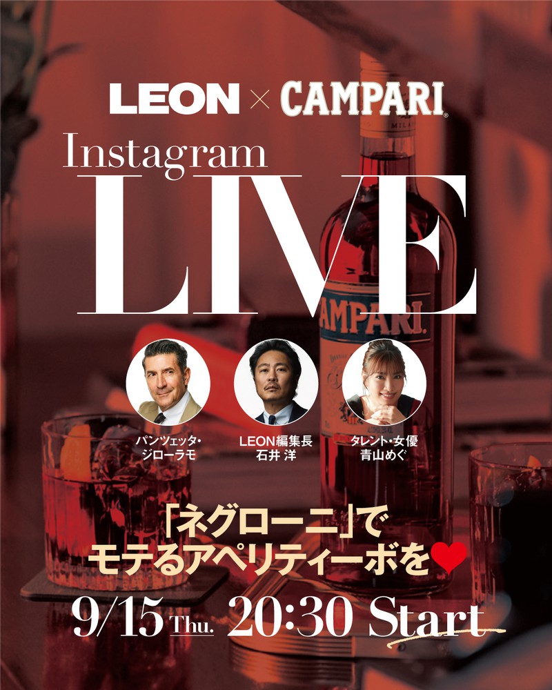 9月15日(木)20:30〜配信スタートとなるインスタLIVEをお届けします。我らがジローラモとタレント・女優の青山めぐさんをゲストに迎え、世界中で愛されるモテるリキュール「カンパリ」の魅力や世界のバーで人気のカクテルとして第1位に輝く「ネグローニ」の楽しみ方を、カンパリアンバサダーの小川尚人さんにご指南いただきます。ぜひご視聴ください!