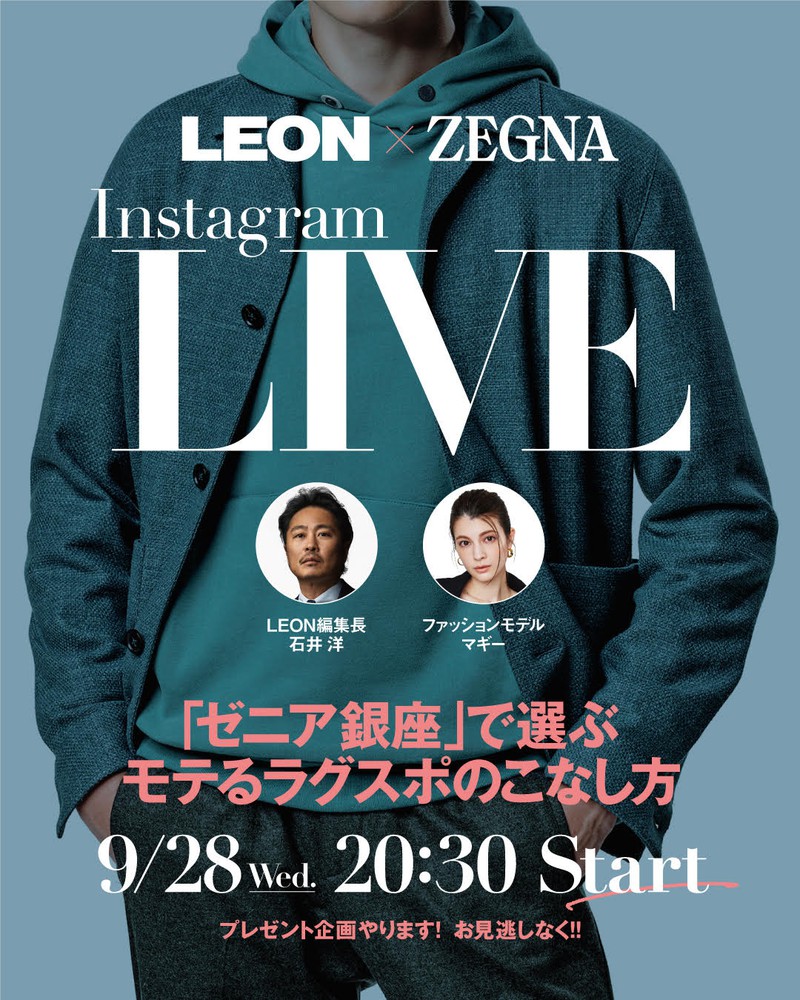 9月28日(水)20:30〜配信スタートとなるインスタLIVEをお届けします。新時代のラグジュアリースタイルを提案するゼニアのフラッグシップストア「ゼニア銀座店」にLEON編集長石井洋が来店。スペシャルゲストにモデルのマギーさんをお迎えし、「ゼニア銀座」で選ぶモテるラグスポのこなし方!をテーマに「ゼニア」の魅力をたっぷりとお伝えします。ぜひご覧ください!