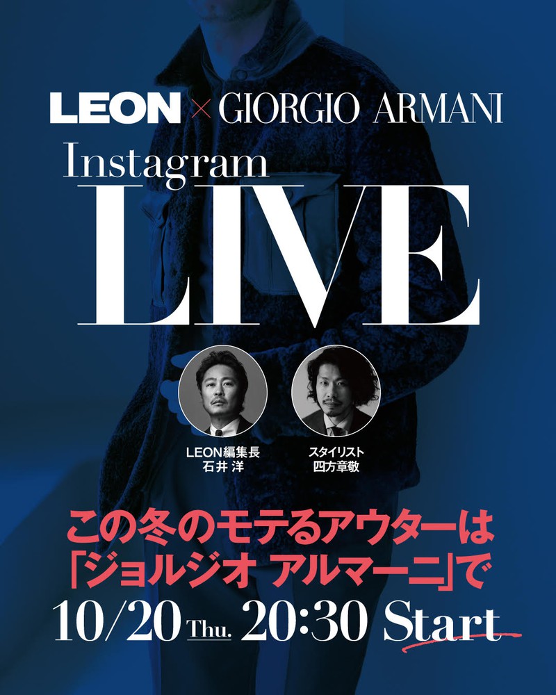 10月20日(木)20:30スタートとなるインスタLIVEをお届けします。テーマは、『この冬のモテるアウターは「ジョルジオ アルマーニ」で』。LEON編集長石井、そしてLEONでおなじみの人気スタイリスト四方さんが『アルマーニ / 銀座タワー』に来店し、この冬のモテるラグジュアリーなアウターをたっぷりご紹介します。ぜひご覧ください!