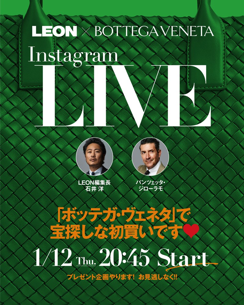 1月12日(木)20:45スタートとなるインスタLIVEをお届けします。テーマは、「ボッテガ・ヴェネタ」で宝探しな初買いです♡ 我らがジローラモとLEON編集長・石井が「ボッテガ・ヴェネタ 銀座フラッグシップ」にお邪魔して、数多あるアイコンから最新最旬のワードローブまで、いまの「ボッテガ・ヴェネタ」の魅力をたっぷりとお伝えします。ぜひご覧ください!