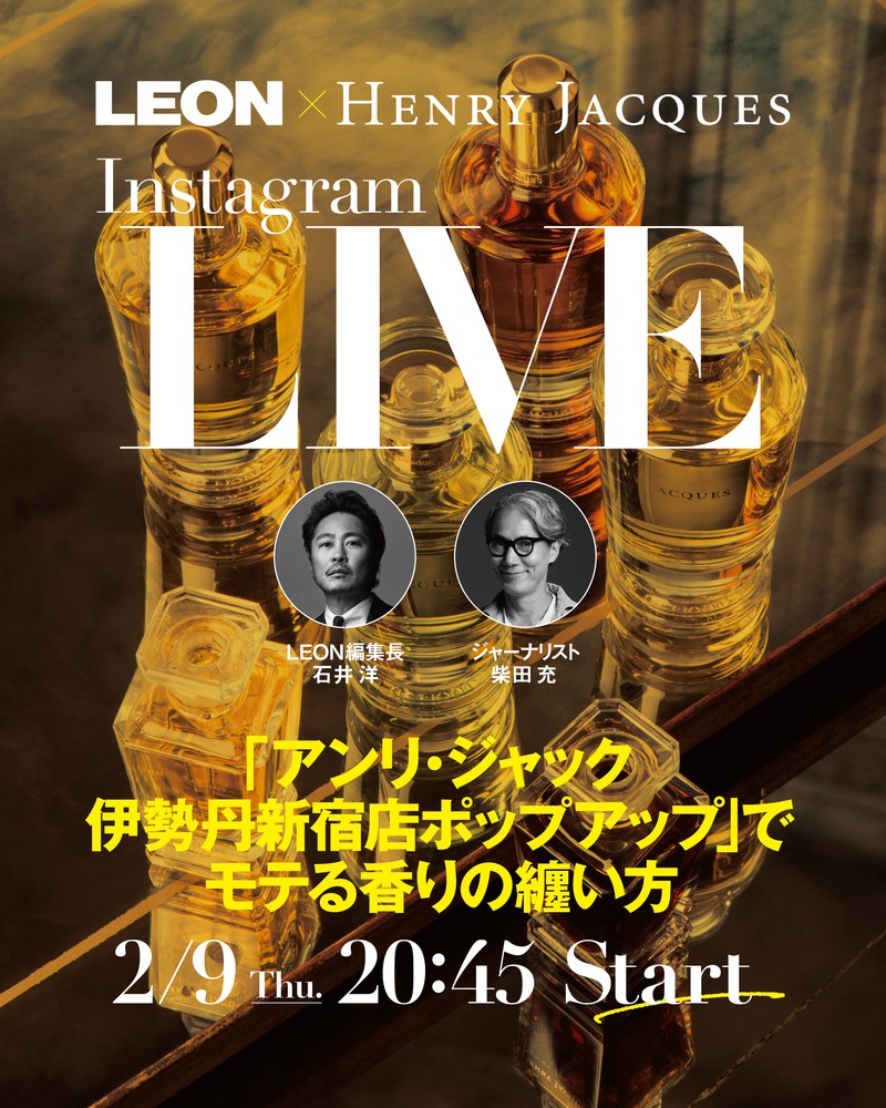 2月9日(木)20:45スタートとなるインスタLIVEをお届けします。テーマは、「アンリ・ジャック伊勢丹新宿店ポップアップ」でモテる香りの纏い方。LEON編集長・石井とジャーナリスト柴田 充さんがただいま開催中の「アンリ・ジャック 期間限定ポップアップサロン」にお邪魔して、世界中のセレブリティを魅了するアンリ・ジャックの魅力、そしてモテる香りの纏い方をお伝えします。ぜひご覧ください!
