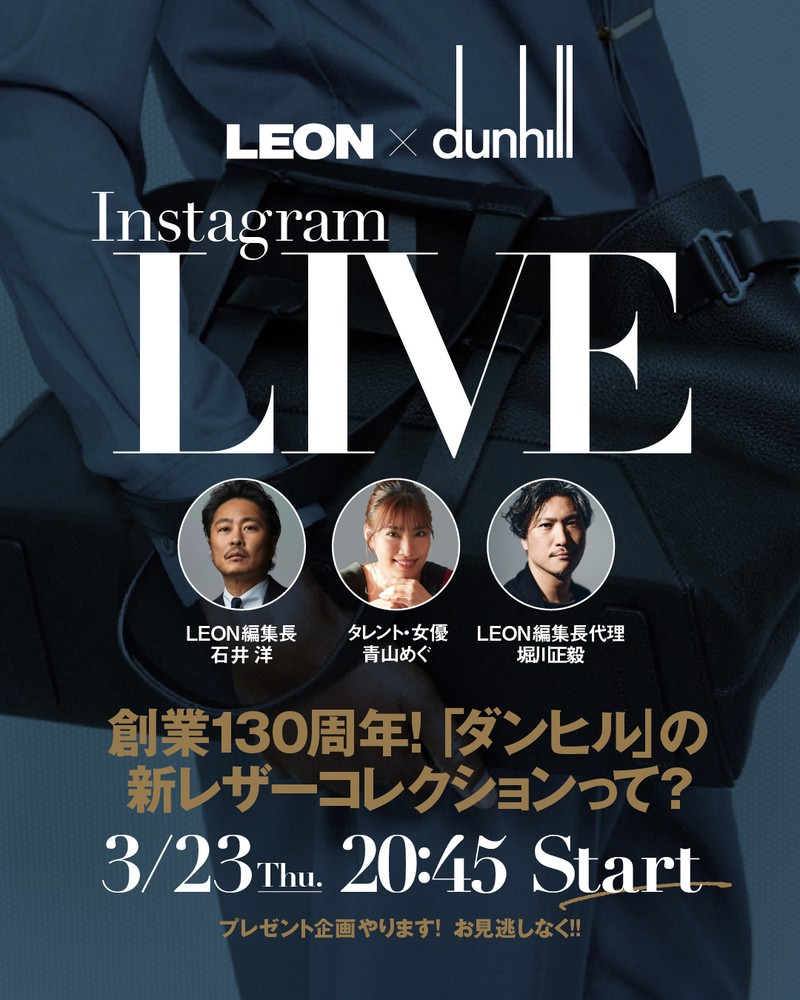 3月23日(木)20:45スタートとなるインスタLIVEをお届けします。テーマはズバリ「創業130周年!『ダンヒル』の新レザーコレクションって?」。タレント・女優の青山めぐさんとLEON編集長・石井、編集長代理・堀川が「ダンヒル 銀座本店」に来店し、新作「1893ハーネス コレクション」の魅力をたっぷりとお伝えします。ぜひご覧ください!