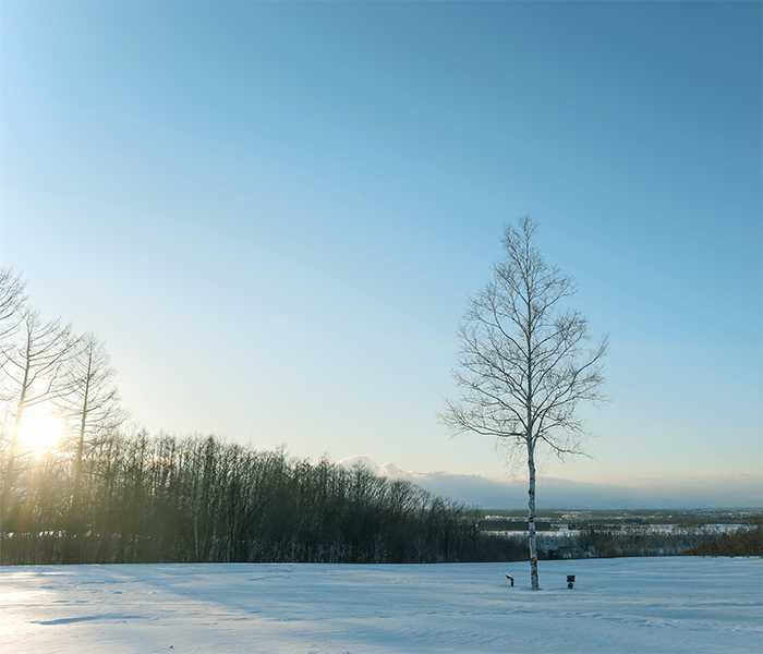 道路の両側には真っ白な雪原が彼方まで広がり、その奥行きを強調するかのように、防風林が垂直に地平へ向かって伸びています。そのコントラストがなんとも美しい!