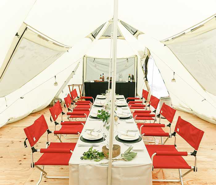 雄大な十勝の山々を一望できるウッドデッキスペースにスノーピーク製の巨大なドームテントが設営され、中には高級レストラン並のテーブルセットが用意されております。さらにその周りにはJYUBAKOと命名された隈研吾氏設計の木製トレーラーハウスが点在、この雄大な景色の中にそのまま宿泊できるわけです。さらにこの施設の素晴らしいのは、人工物と景色が調和し、モダンかつリッチなパノラマとして成立していること。十勝の雄大な景色が素晴らしいことはもちろんですが、それに頼りきることなく、むしろ都会的なエッセンスをしっかり取り入れ、自然の魅力をブーストさせている、そのセンスに非凡なるものを感じた次第。さすが、オートキャンプの創始者!であります。