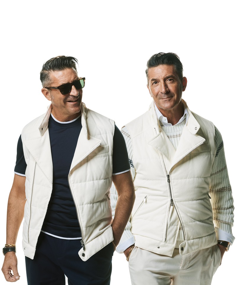 右●ダウンベストは左と同じ。ニット14万8500円、シャツ5万3900円、パンツ7万9200円/すべてブルネロ クチネリ(ブルネロ クチネリ ジャパン)、時計220万円/ゼニス、そのほかはスタイリスト私物