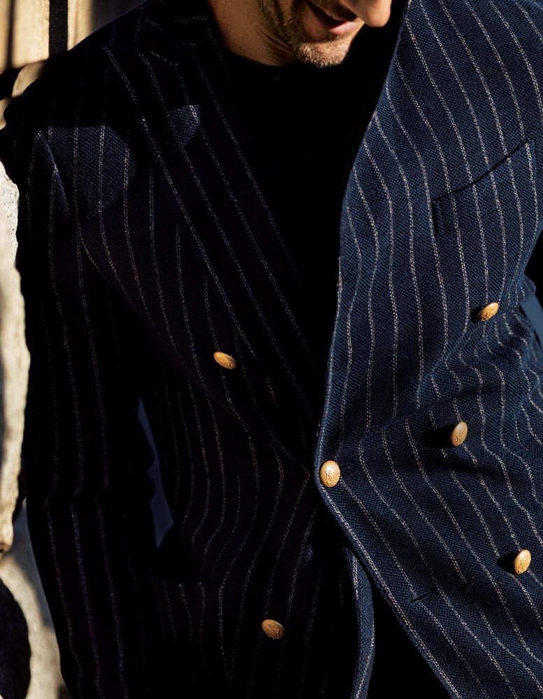 そんななか、塩梅絶妙の一着とLEONが目をつけたのが、メタルボタンのニットブレザーです。コレ、アイテムとしてはおなじみのニットジャケットなんですが、メタルボタンをあしらったブレザースタイルである点が最大のポイント。そのことで“まるで家着”な着心地はそのままに、リッチで洒脱な街着感が強調されるのです。