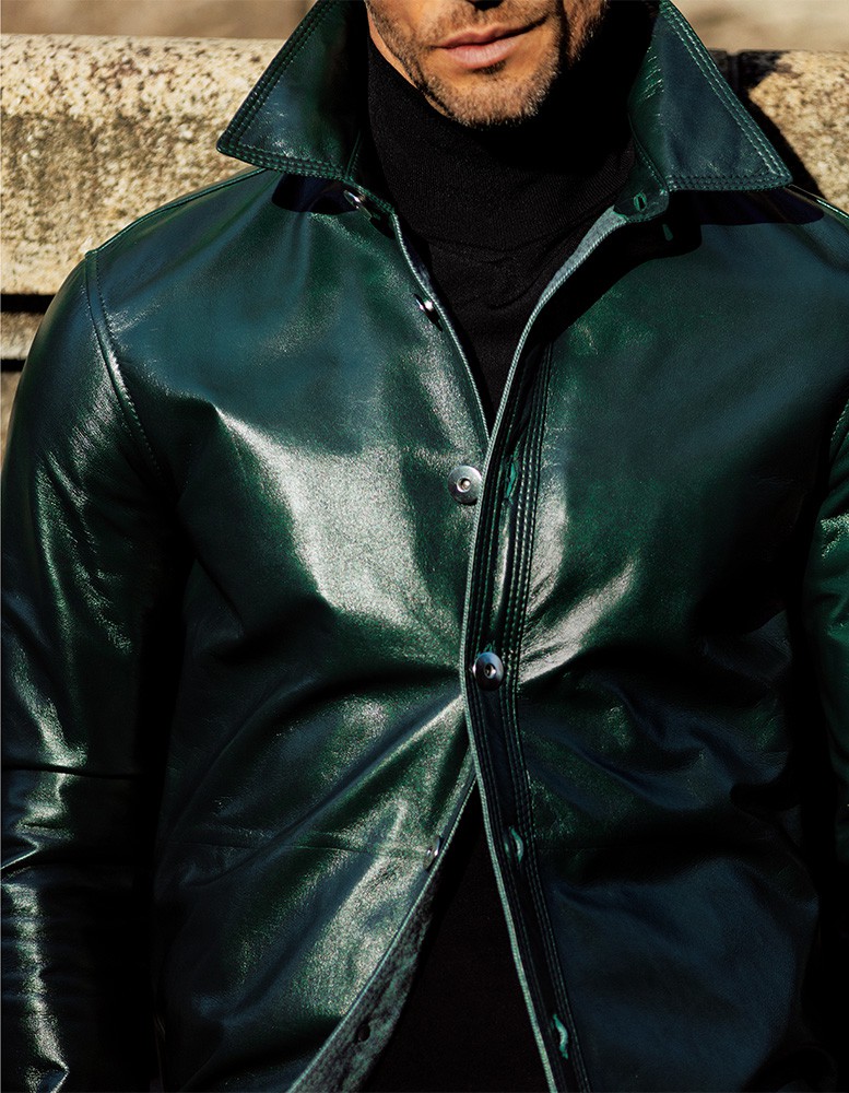 その名のとおり上質素材を用いたレザーシャツですから、そりゃ一発でリッチが薫ります。さらに、合わせるパンツやニットとの素材感の違いから、装いに豊かな奥行きをもたらすこともできるのですね。