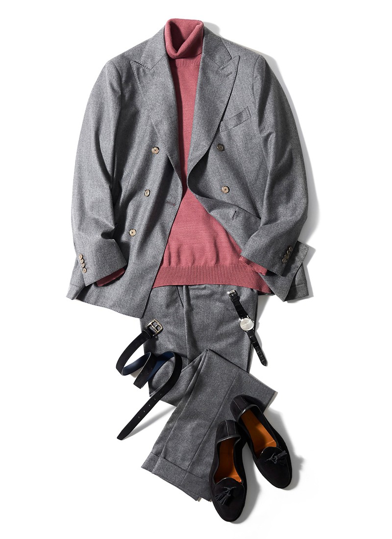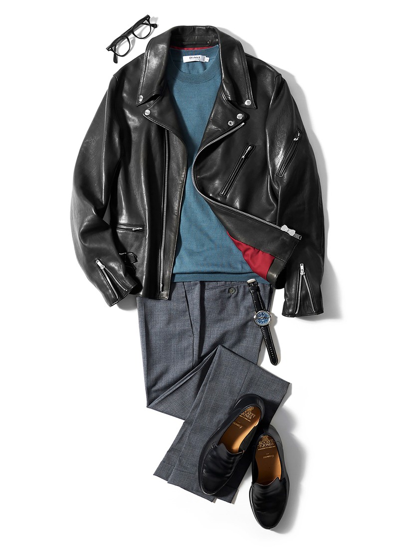 しかし、優しげなスモーキーブルーのニットをプラスすれば、落ち着いた洒落感が演出できるので、大人な着こなしに。眼鏡や本格時計を添えることでさらに知的な雰囲気も引き立ちます。