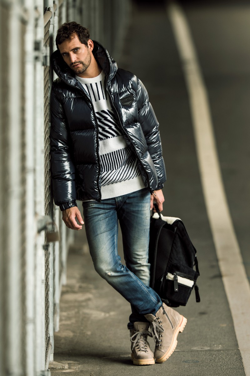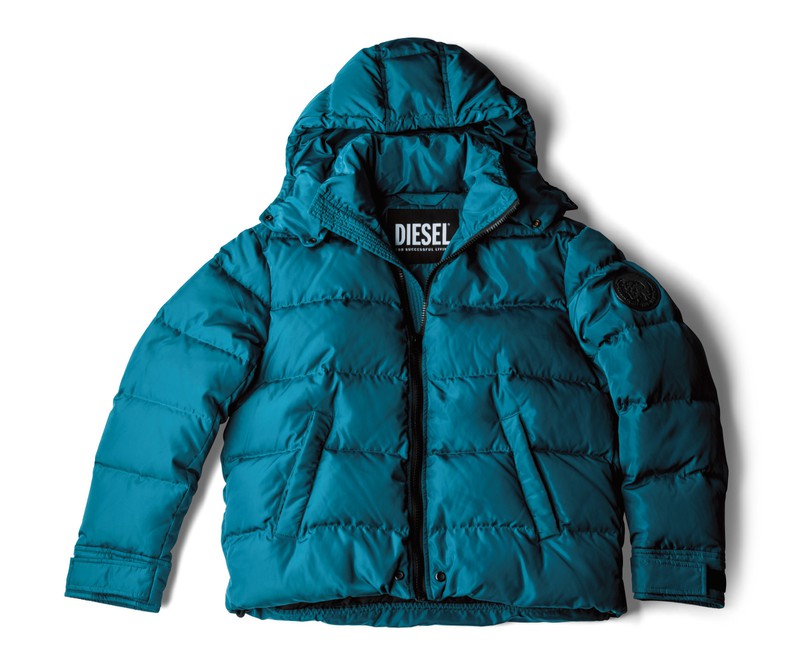 シャイニーな光沢と陰影を兼ね備えたブルーの色味とドライタッチのシャカシャカ感が魅力の短丈ダウンジャケット。シンプルな一着ながら、バックには光沢のある同系トーンのプラスチゾルプリントで「ONLY THE BRAVE」のロゴをデザイン。着脱式フード付き。5万6000円/ディーゼル(ディーゼル ジャパン)