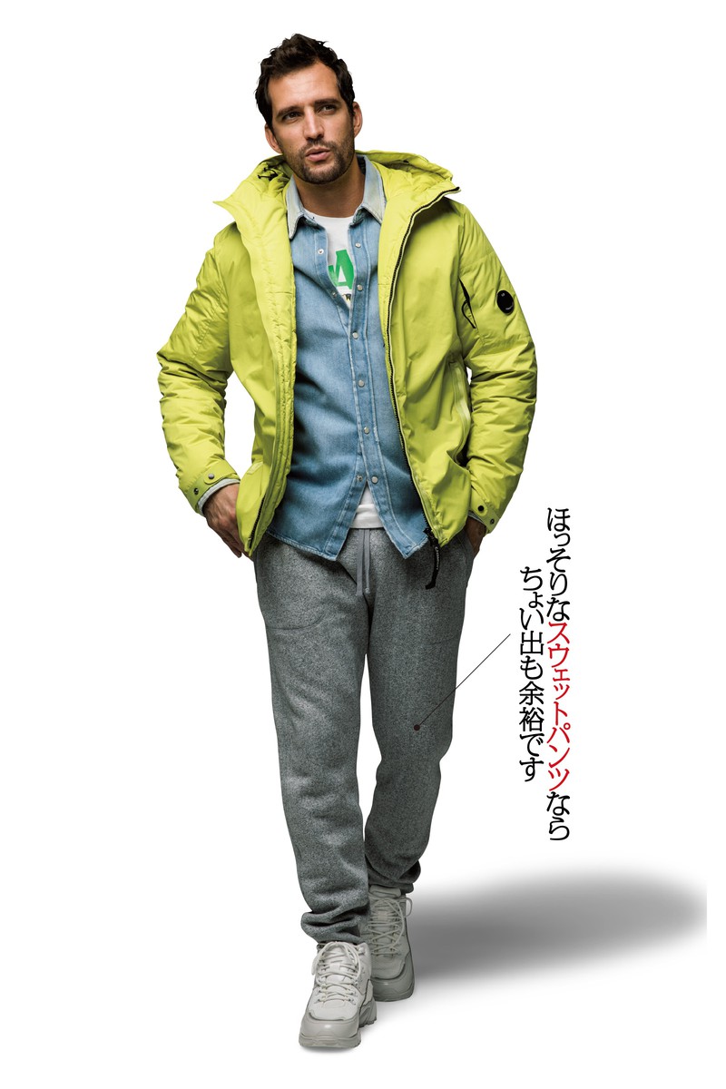 ダウンにスウェットパンツってユルすぎて難しい? そんなスポーツテイスト溢れる着こなしを洒脱に装うポイントは、スウェットパンツのシルエットにあり。アップデイト感が光る一本ならしっかり都会的にキマります。ダウン7万8000円/C.P.カンパニー(トライステイト ジャパン)、シャツ1万7000円/トミー×ルイス(トミー ヒルフィガー カスタマーサービス)、Tシャツ7800円/ディーゼル(ディーゼル ジャパン)、パンツ1万9500円/レイニング チャンプ(サザビーリーグ)、靴4万5000円/タトラス(タトラスインターナショナル)