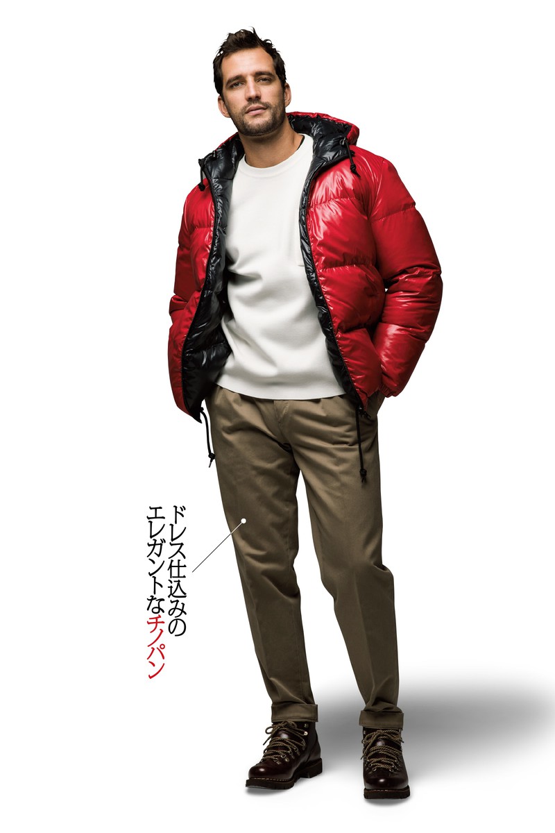 赤の短丈ダウンに白T&チノパンのコーディネートといえば、泣く子も黙るアメカジの王道スタイル。ですが、インナーが上質な半袖ニット、チノがドレス仕込みのエレガントなテーパードシルエットを備えた一本なら、昔のソレとは似て非なるもの。やんちゃな気分はそのままに、ちゃ〜んといまどきの大人仕様となるのです。ダウン5万4000円/トミーxルイス(トミー ヒルフィガー カスタマーサービス)、ニット1万6000円/エストネーション、パンツ3万5000円/ピーティーゼロウーノ(トゥモローランド)、靴6万8000円/パラブーツ(パラブーツ青山店)