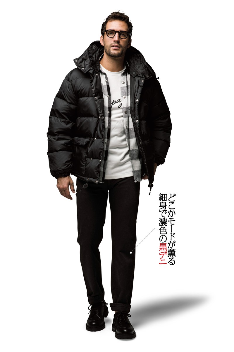 黒の短丈ダウンに濃色の黒デニを合わせれば、ほのかにモードさえ薫るクールなカジュアルに。ダウン4万2800円/ホルバー(アンカットバウンド 新宿店)、シャツ2万2000円/リサウンド クロージング、Tシャツ8800円/マイアミビーチビーチホテル1955(スタジオルート134カスタマーサービス)、パンツ2万7000円/トムウッド(ステディ スタディ)、靴6万4000円/ヒルフィガー コレクション(トミー ヒルフィガー カスタマーサービス)、メガネ3万7000円/ジュリアス・タート・オプティカル(G.B.ガファス)