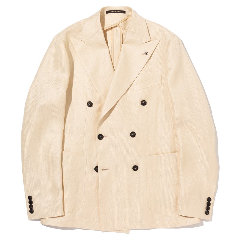 アンコン仕立ての「モンテカルロ」の中でも、柔らかなリネンで編まれたヘリンボーン生地にウッド調のボタンを配したこちらは、リゾートにもぴったりな一着。ダブルではありますが、軽快に着こなせます。