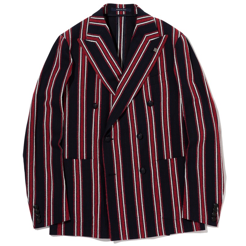 英国チックなクラブストライプを採用したこちらは、「ダレル」というモデル。ゴージラインが高いスタイリッシュなディテールが、ウエストを絞ったタリアトーレらしいシルエットと抜群のマリアージュ。クラシカルなのにどこかモダンな雰囲気が漂います。