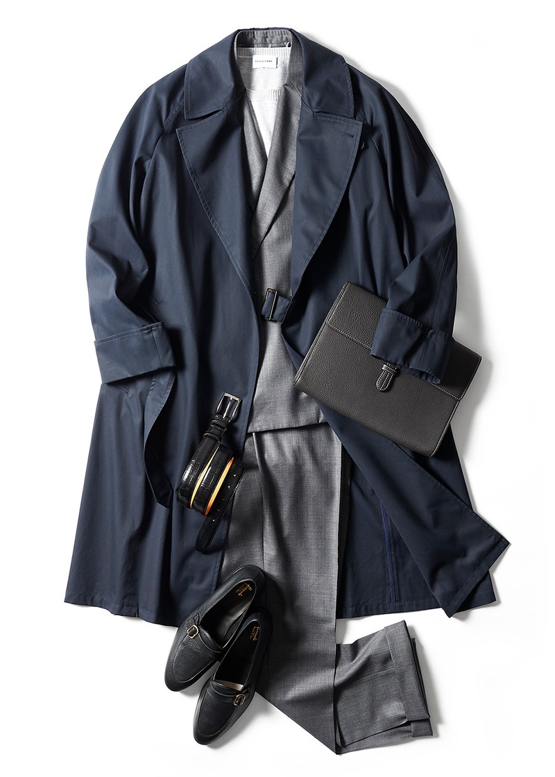 ここでは、グレー杢のソフトなダブルスーツを軸に、ユルッとした紺のタイロッケンコートと黒のベルジャンシューズをコーデ。定番色に徹することで、品行方正な雰囲気を保ったまま、こなれた印象が出せるのです。